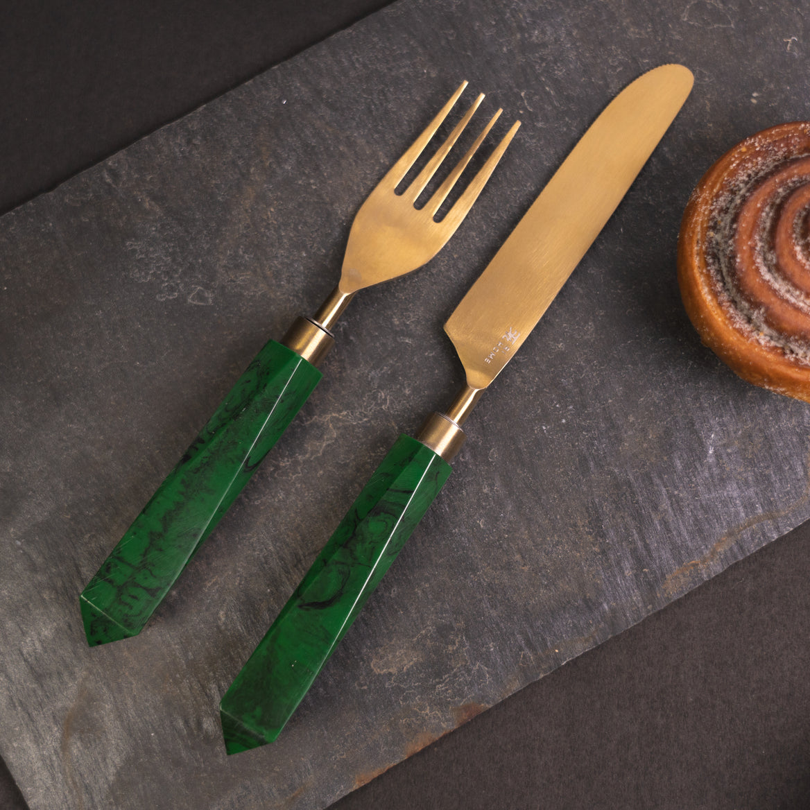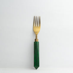 This elegantly designed dinner fork features a sleek matte gold finish and a comfortable green resin handle. Ideal fo...