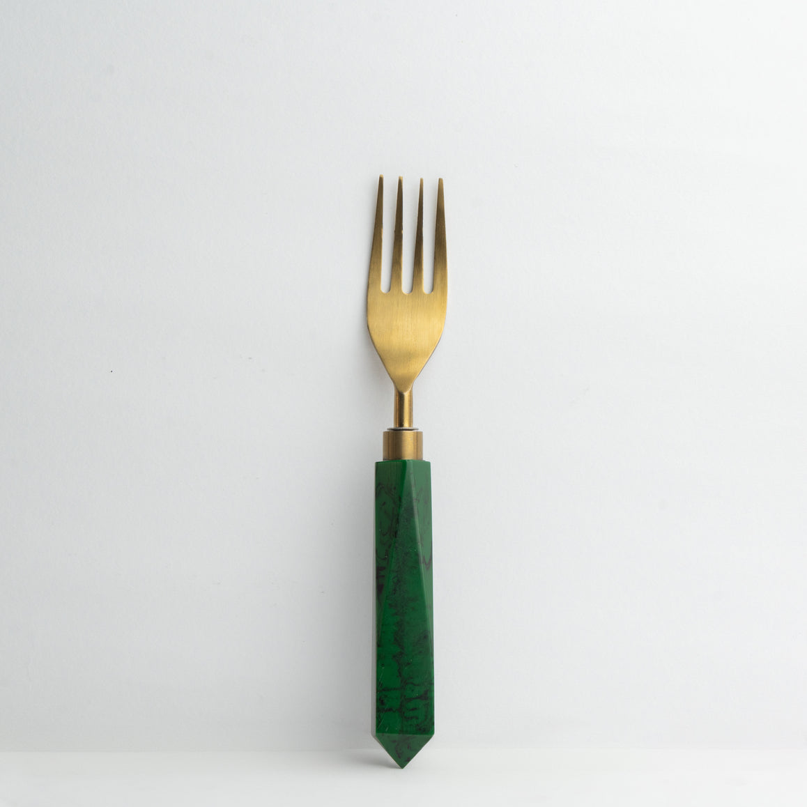 This elegantly designed dinner fork features a sleek matte gold finish and a comfortable green resin handle. Ideal for main courses, it offers a refined dining experience with every bite.
