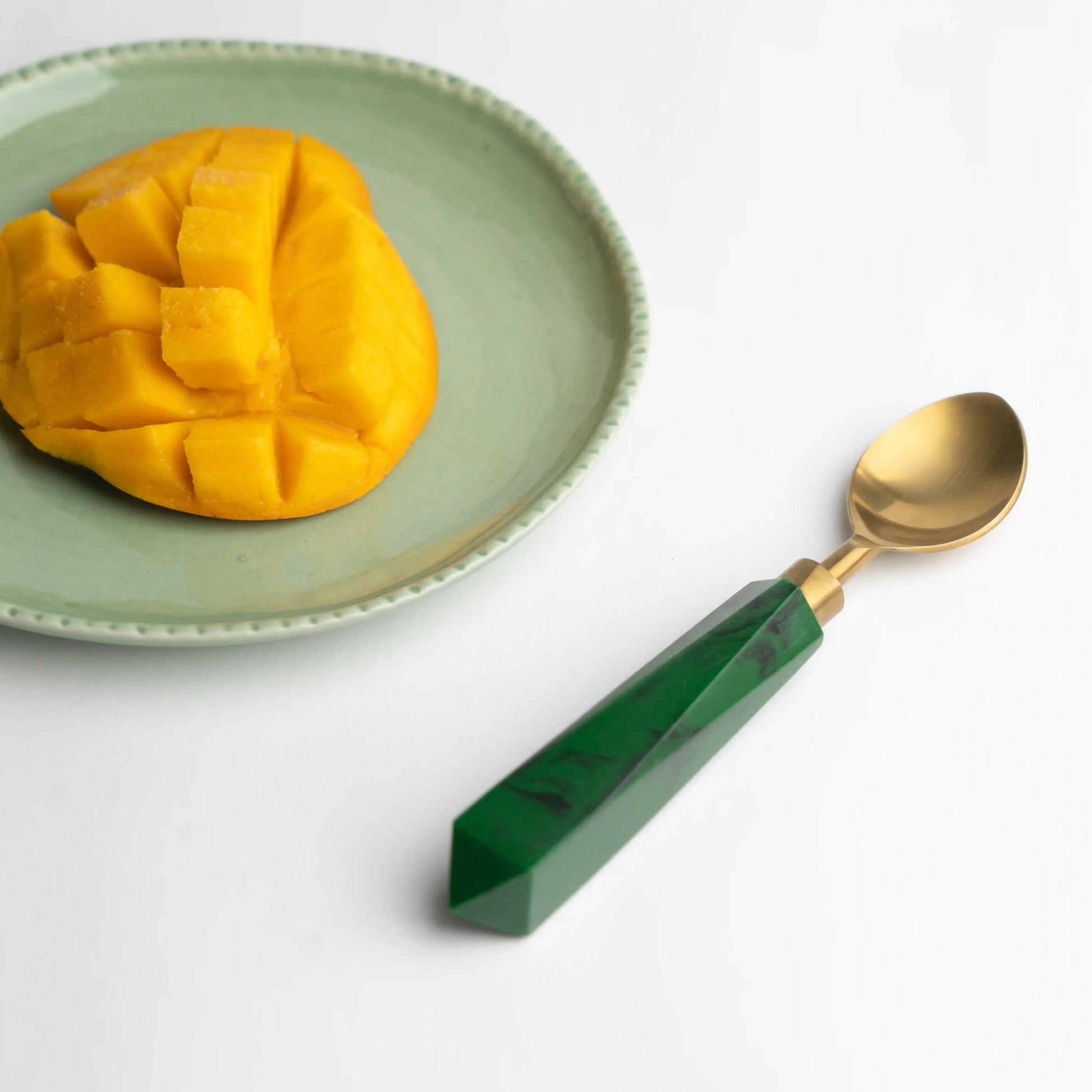 Perfectly sized for desserts, this small spoon features a shiny matte gold finish and a green resin handle, making it both a functional and stylish addition to your cutlery collection.