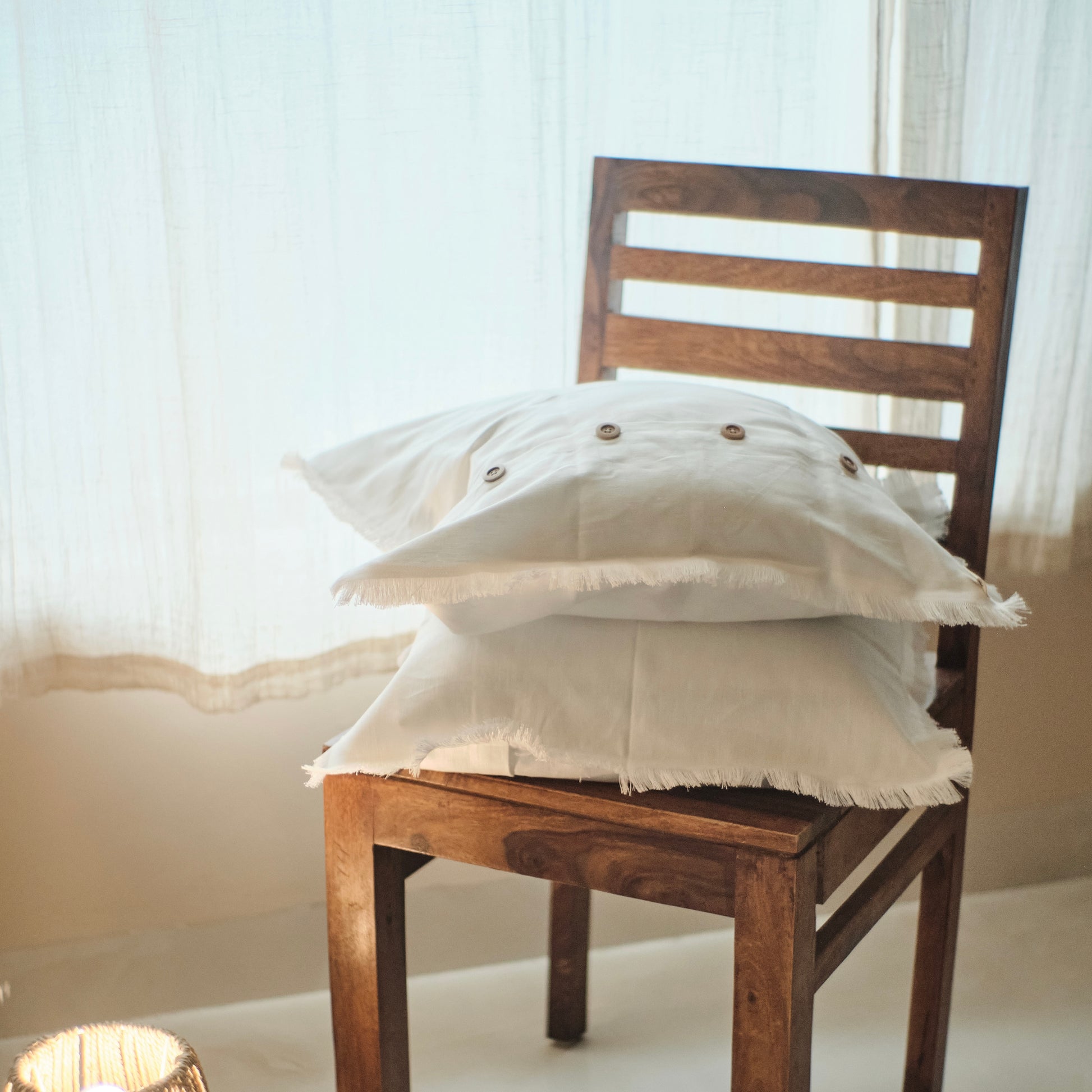 Elevate your space with the Sukham Linen Cushion Covers, featuring raw edges for a chic, rustic finish. Crafted from ...
